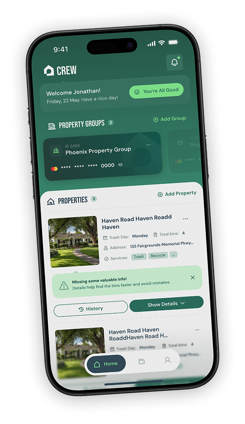 Our founding team has personally hosted over 55,000 guests in their own properties, so we understand the real challenges of managing trash. That’s why we built Crew—a digital trash pickup and trash can app designed by hosts, for hosts. Whether you need can to curb service or same-day emergency trash removal, our trash day app ensures your bins are handled reliably every time.